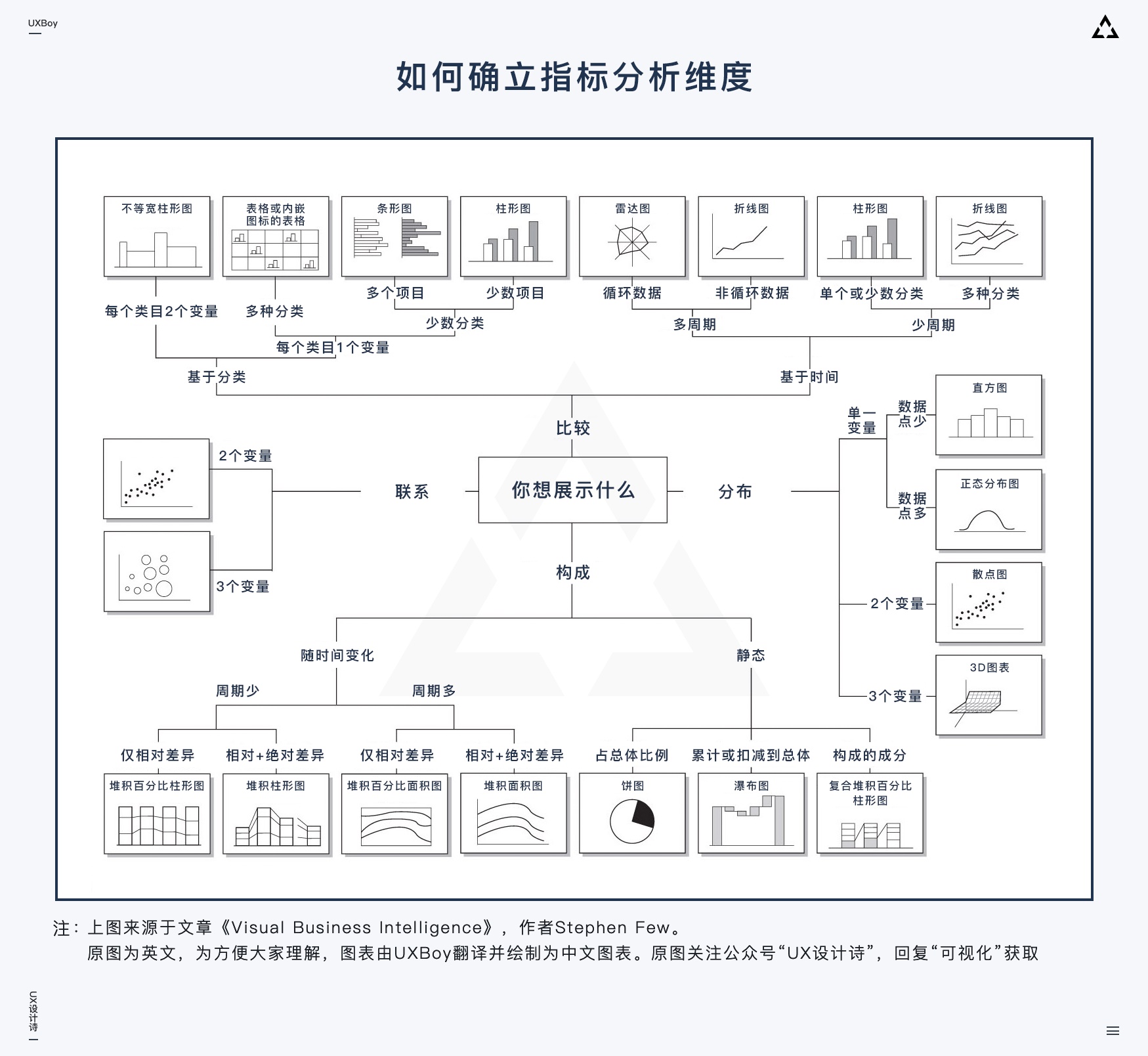 上圖向大家展示了數(shù)據(jù)分析常用的4個(gè)維度,我們?cè)谶x定指標(biāo)后,就需要跟項(xiàng)目組其他小伙伴討論:我們的各個(gè)指標(biāo)主要想給大家展示什么,更進(jìn)一步的講,是我們想通過(guò)可視化表達(dá)什么樣的規(guī)律和信息。而上圖,可以引導(dǎo)我們從「聯(lián)系、分布、比較、構(gòu)成」四個(gè)維度更有邏輯的思考這個(gè)問(wèn)題。