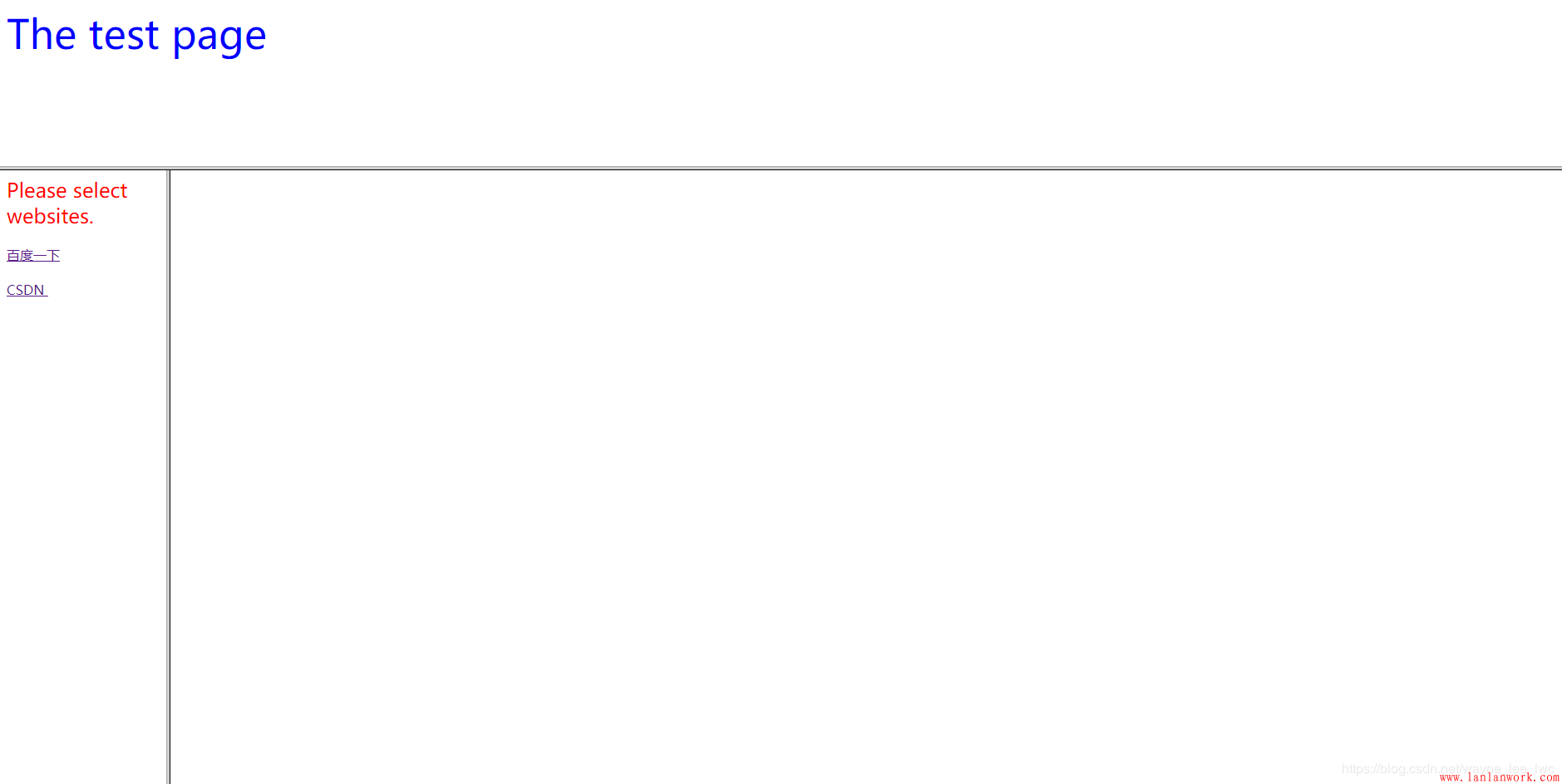 <html> <head></head> <frameset rows="500,*" border="3" noresize="noresize"> </frame> </html>看上面的代碼,用frameset替換掉body不難理解,畢竟我們約定做框架的網(wǎng)頁(yè)不具有實(shí)體內(nèi)容 接著,這里提到了框架標(biāo)簽的三個(gè)屬性,分別為: rows/cols 框架的分行或分列 border 分隔框的寬度 noresize 大小是否可調(diào) 現(xiàn)在來(lái)分別解釋一下 第一個(gè),rows 或cols 屬性,代表了框架的分行或分列的情況,在引號(hào)內(nèi)書寫該屬性的值的時(shí)候,不需要指明分成幾欄,只需要指明每一欄占據(jù)的寬度或高度(單位為像素)并使用逗號(hào)隔開。瀏覽器在解析的時(shí)候會(huì)計(jì)算到底分成了幾欄。另外,不指定寬度而使其占據(jù)剩余位置時(shí),可以使用通配符 “ * ”。 第二個(gè),border 屬性,代表了分隔框的寬度,這是屬性的數(shù)值單位是像素。所以如果你不想加入邊框,則可以將它設(shè)置為零。 第三個(gè),noresize 屬性,表示我們的框架的大小是否可調(diào),frameset標(biāo)簽?zāi)J(rèn)為大小可調(diào),當(dāng)用戶鼠標(biāo)移動(dòng)到邊框上時(shí),他可以拖拽改變大小。所以如果不想讓用戶隨意改變框架大小,那么可以選擇使用這個(gè)屬性 (當(dāng)然,也可以選擇把邊框的寬度設(shè)為零,讓他找不到)。 這個(gè)屬性的值同屬性名稱一樣。 最后還需要說(shuō)明的是:框架集標(biāo)簽是可以進(jìn)行嵌套的,也就是說(shuō),在已經(jīng)分出來(lái)的框架中,我們可以借著分欄。 在框架內(nèi)鑲嵌網(wǎng)頁(yè) 剛剛我們使用 frameset 標(biāo)簽將網(wǎng)頁(yè)變成框架并劃分成了若干區(qū)域,每一個(gè)區(qū)域都是一個(gè)單獨(dú)的可顯示頁(yè)面的子網(wǎng)頁(yè)(筆者起的名)?,F(xiàn)在,我們需要在這些區(qū)域內(nèi)為它鑲嵌上一個(gè)網(wǎng)頁(yè),這需要用到frame這個(gè)單標(biāo)簽在框架下添加網(wǎng)頁(yè),它的寫法如下: <frame src="...." name="...." /> 1 這里可以看到 frame 標(biāo)簽的兩個(gè)屬性; src 和 name 。它們分別代表著添置連接(這是一個(gè)超鏈接,網(wǎng)頁(yè),HTML文件,圖片等都是可以的。有關(guān)超鏈接的信息,可參照上一篇學(xué)習(xí)總結(jié)或者問(wèn)問(wèn)度娘 ),以及框架名稱。 框架的命名,很主要的一個(gè)原因在于可以重復(fù)利用一個(gè)框架,即在其他標(biāo)簽使用時(shí),可以在某個(gè)框架上顯示相應(yīng)內(nèi)容。還記得上一篇中,我們提到的鏈接標(biāo)簽 target 屬性中的 “某框架名稱” 這個(gè)值嗎?在為框架命名后,就可以使用上述的 target 用法,將打開的網(wǎng)頁(yè)放在某個(gè)框架中了。 綜上,舉個(gè)例子: 先來(lái)創(chuàng)造一個(gè)帶有嵌套的框架<!--frame--> <html> <head></head> <frameset rows="200,*" border="5" noresize="noresize"> <frame src="title.html" name="title" /> <frameset cols="200,*"> <frame src="selection_bar.html" /> <frame name="output_page" /> </frameset> </frameset> </html><!--title--> <html> <head></head> <body> <font size="7" color="blue"> The test page </font> </body> </html>