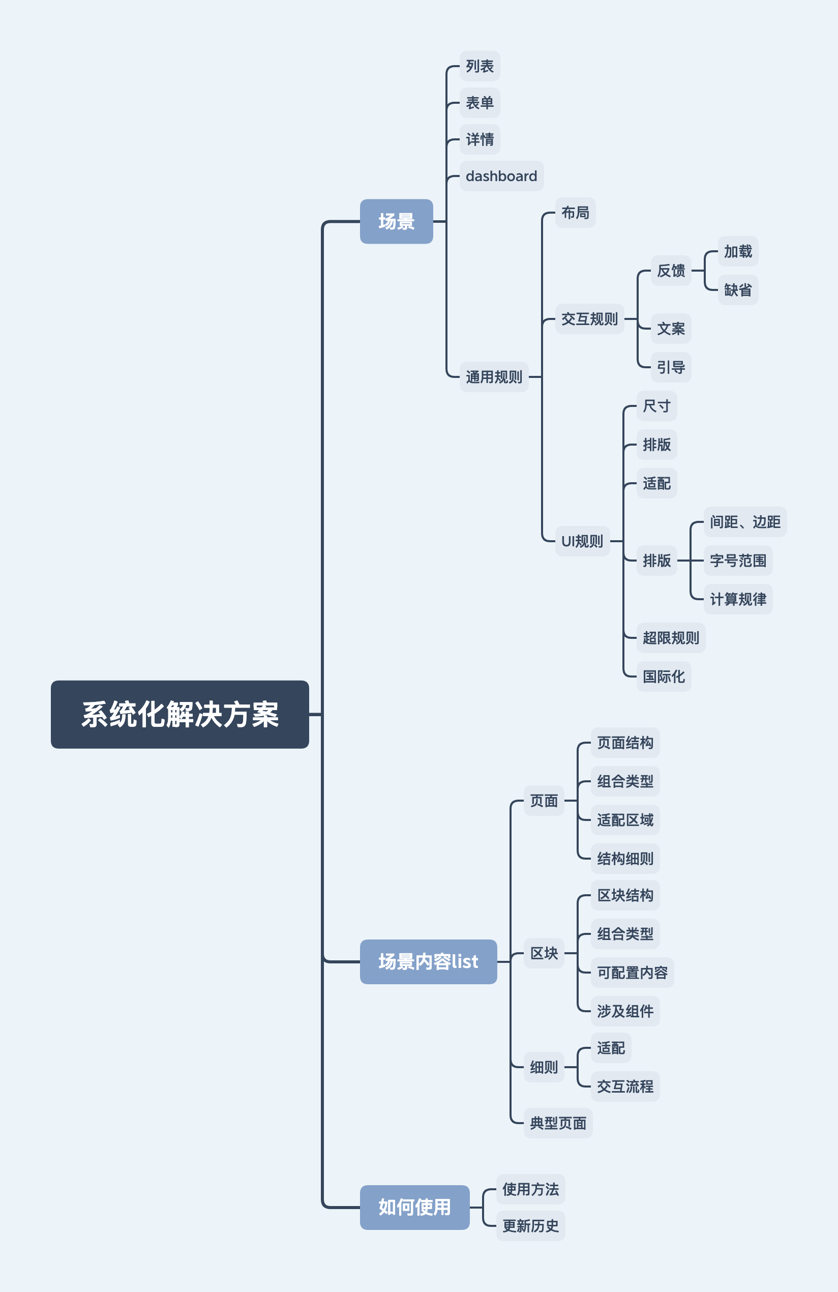 從第一步全盤(pán)的信息拆解和歸納, 已經(jīng)發(fā)現(xiàn)問(wèn)題, 這一階段主要2點(diǎn):第一是如何通過(guò)設(shè)計(jì)規(guī)則來(lái)避免同樣的問(wèn)題產(chǎn)生,第二是如何通過(guò)簡(jiǎn)單的規(guī)則重組減少多人合作記憶復(fù)雜度。思路類(lèi)似于設(shè)計(jì)一個(gè)界面,首先得有一個(gè)布局劃分,不同的區(qū)塊要放哪些內(nèi)容,再到區(qū)塊里的細(xì)節(jié)內(nèi)容規(guī)則,從而抽象出由布局到區(qū)塊的設(shè)計(jì)規(guī)則和可復(fù)用的組件。