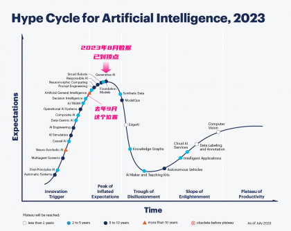 去年9月份,「Gartner」就預(yù)測生成式AI已經(jīng)進(jìn)入期望膨脹高位,到2023年8月「Gartner」剛發(fā)布人工智能技術(shù)成熟度曲線,生成式AI從技術(shù)萌芽期到技術(shù)膨脹期的頂峰,跟過去一段時間AI在學(xué)術(shù)、產(chǎn)業(yè)、資本領(lǐng)域的爆火完全呼應(yīng)。