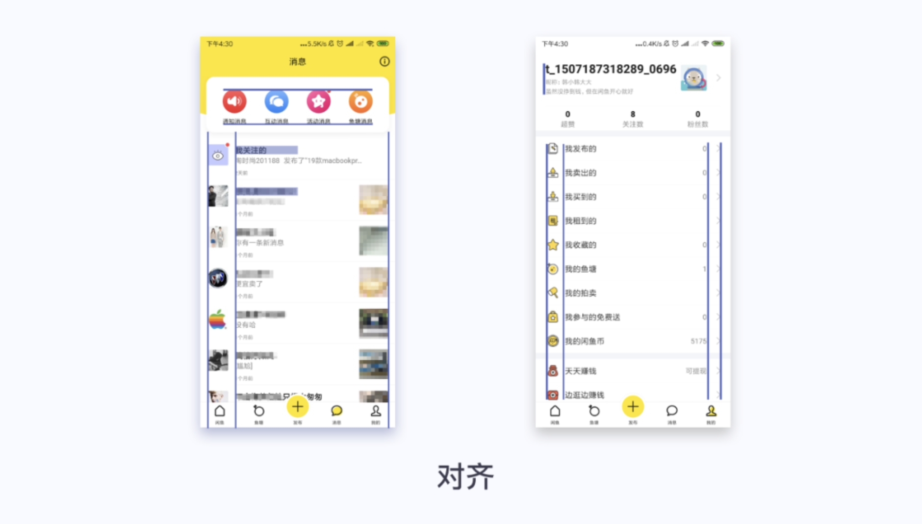 閑魚消息頁面頂部功能區(qū)域采用居中對齊方式,比較正式一些,突出顯示引導(dǎo)用戶點擊;個人頭像和消息左對齊顯示,發(fā)布圖片右對齊顯示。