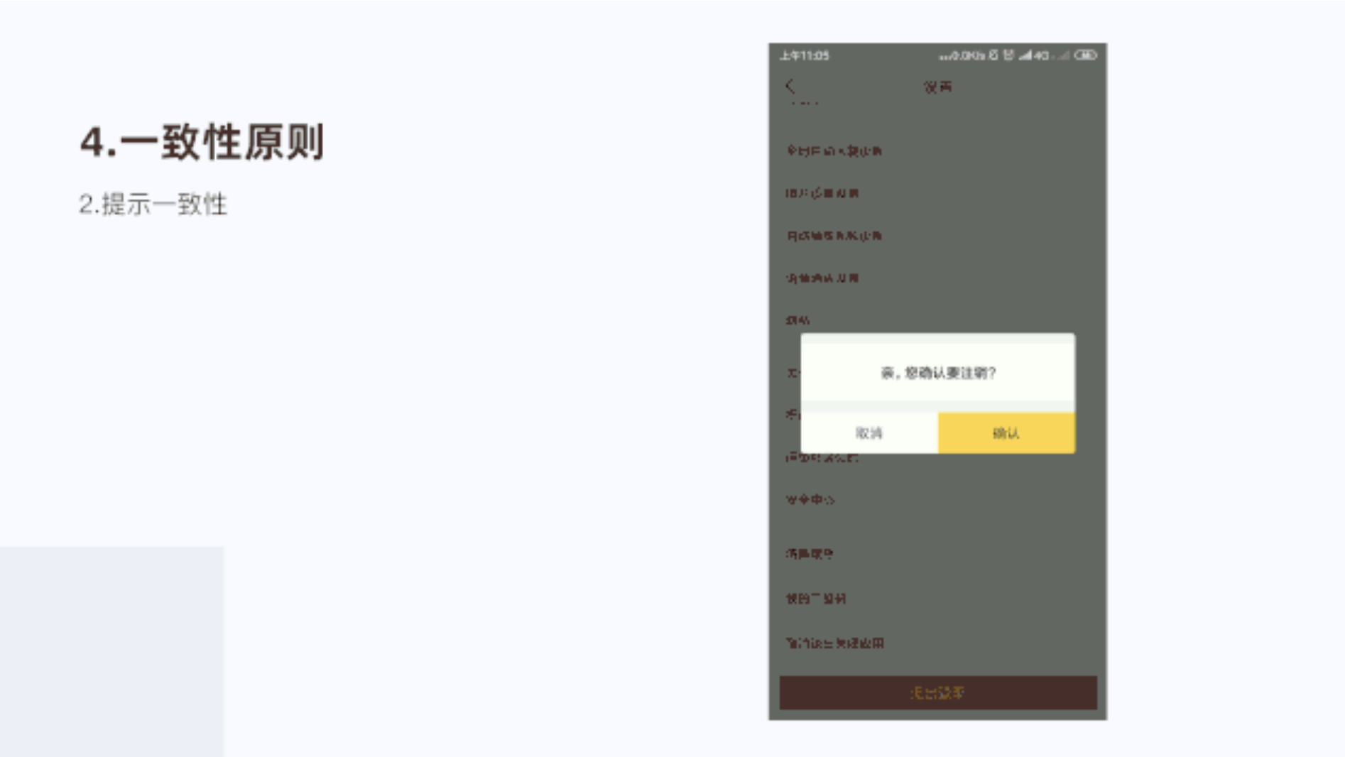 在退出登錄提示是否要注銷登錄,把確認(rèn)層級加大,放在右邊,清晰提示用戶,防止用戶出錯