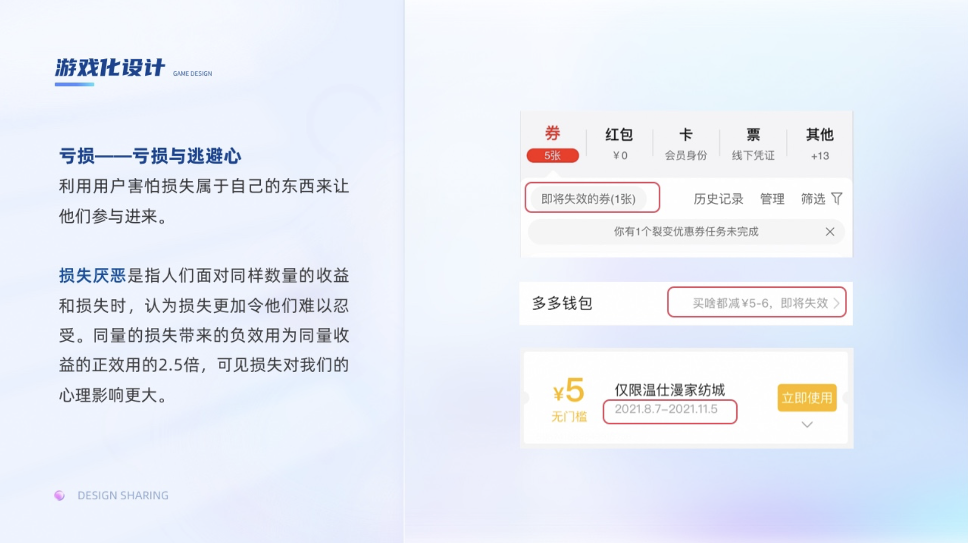 利用用戶害怕?lián)p失屬于自己的東西來讓他們參與進(jìn)來。可以結(jié)合損失厭惡來理解。損失厭惡是指人們面對同樣數(shù)量的收益和損失時,認(rèn)為損失更加令他們難以忍受。同量的損失帶來的負(fù)效用為同量收益的正效用的2.5倍,可見損失對我們的心理影響更大。比如商家發(fā)給你的免費優(yōu)惠券,其實你本身不需要購買什么,但是商家偏偏在優(yōu)惠券上加上時效性,超過活動日期就置灰了,即使你原本沒有購買需求,但是感覺沒用掉優(yōu)惠券就像損失了優(yōu)惠券的錢一樣,就會去購買,甚至為了湊單購買更多東西。