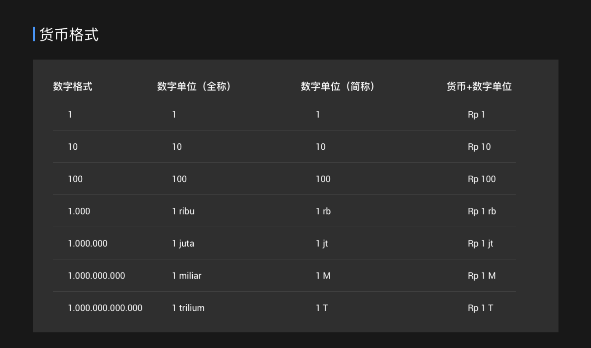 印尼的貨幣符號是 Rp,貨幣名稱是 IDR ( 印度尼西亞盧比)。 在印尼,表示千位的寫法有兩種,Rp2.000 或者是 Rp2 rb ( rb 是 ribu 的縮寫 ), 但是 Rp2.000 的用法更多些。印尼沒有萬的概念,對于大額的數(shù)字,在正式場景中,比如商品標(biāo)價或銀行的收據(jù),都會將金額全部展示出來,不會使用縮寫。只有在非正式場合,例如需要快速吸引人眼球的新聞標(biāo)題或海報中才會出現(xiàn)。