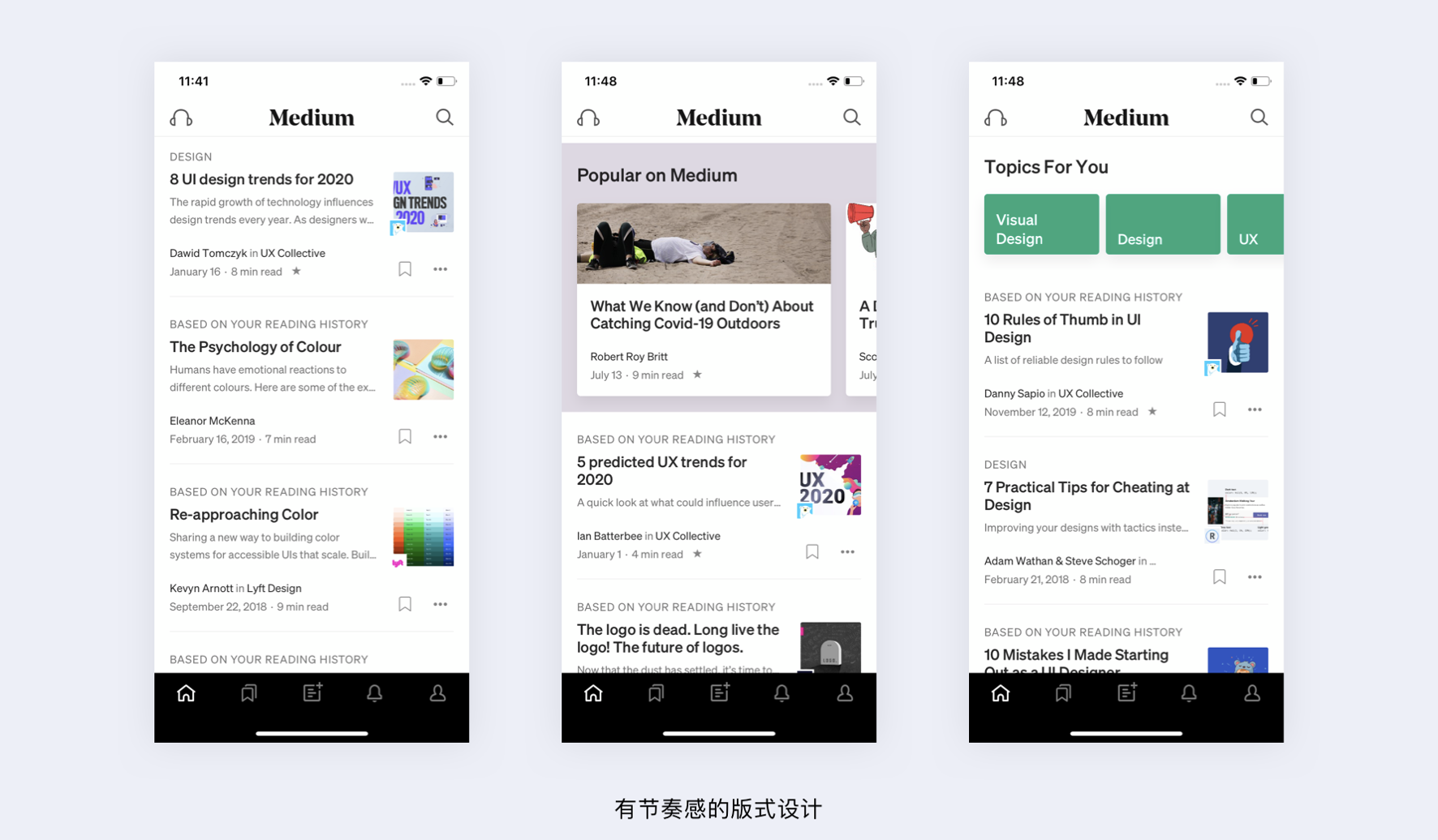 - 節(jié)奏感設計:在統(tǒng)一樣式中穿插不同模塊,如 Medium、網易云音樂的版式設計。