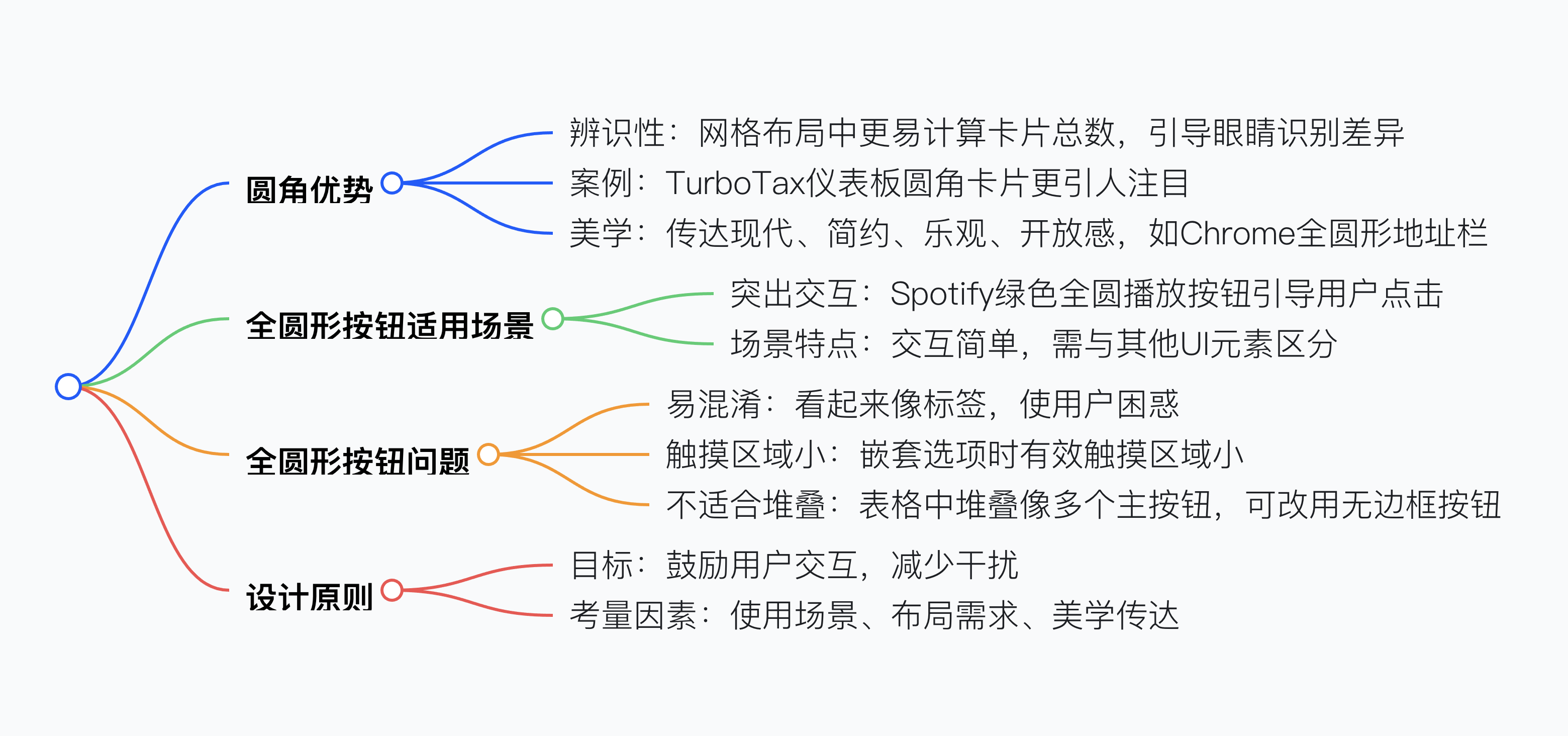 UI 設(shè)計(jì)中按鈕用圓角還是直角需綜合考量,圓角在網(wǎng)格布局中更易辨識(shí),如 TurboTax 儀表板中圓角卡片比尖角更引人注目,全圓形按鈕在 Spotify 中因突出交互引導(dǎo)成功,但全圓形按鈕可能被誤認(rèn)標(biāo)簽、嵌套選項(xiàng)觸摸區(qū)域小、不適合堆疊,而直角按鈕在表格等堆疊布局中更合適,此外圓角傳達(dá)現(xiàn)代、簡(jiǎn)約等感覺,像 Chrome 瀏覽器更新為全圓形地址欄,總之設(shè)計(jì)需以鼓勵(lì)用戶交互、減少干擾為目標(biāo),而非單純選擇圓角或直角。