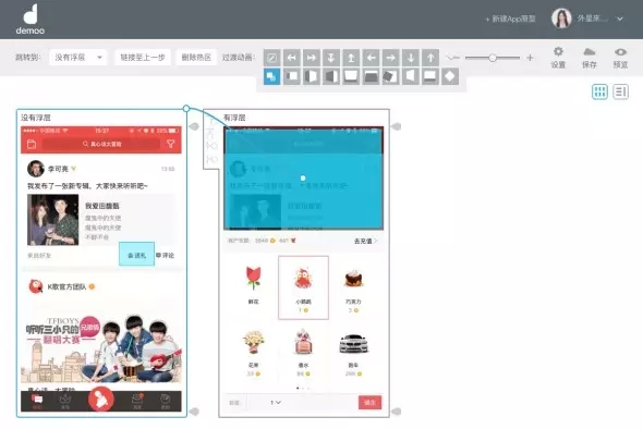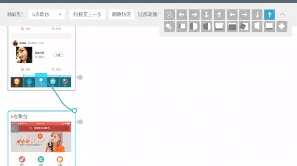 真實的app中,頁面間常常通過方向來示意層級關(guān)系,例如重新創(chuàng)建的流程,通常創(chuàng)建頁面會從底部向上呼起,于是,在建立熱區(qū)鏈接過程時,我們需要對鏈接進行方向設(shè)定。如圖示,我將點歌臺呼起的頁面出現(xiàn)形式,設(shè)定為從下往上出。如果不是很確定切換效果,Demoo很細心的在這里設(shè)計了動畫預(yù)覽,鼠標停留在小方塊上時,會有微動畫示意,多看幾遍也就明白了。