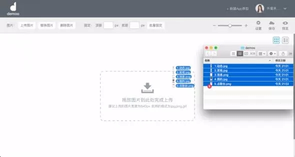 在設(shè)計工具中,我已經(jīng)設(shè)計好了全民K歌5個主要頁面的圖并命名好保存在文件夾中,準備開始制作原型。如圖所示,Demoo支持批量導(dǎo)入圖片,將我需要的圖片全部選中,拖放到虛框內(nèi),即可完成圖片導(dǎo)入工作。導(dǎo)入后,就相當(dāng)于你已經(jīng)把app原材料都放到工作臺啦,之后操作起來就會特別方便。