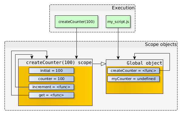 "use strict"; function createCounter(initial) { // ... } var myCounter1 = createCounter(100); var myCounter2 = createCounter(200);