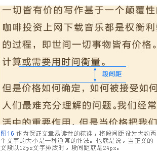 作為保證文章易讀性的標(biāo)準(zhǔn),將段間距設(shè)為大約兩個(gè)文字的大小是一種通常的作法。也就是說,當(dāng)正文的文段以12p文字排版時(shí),段間距就是24px。當(dāng)然,這個(gè)標(biāo)準(zhǔn)也并不是絕對(duì)的,有時(shí)候也可以通過刻意地設(shè)定狹窄的段間距,給讀者帶來內(nèi)容緊湊的印象。