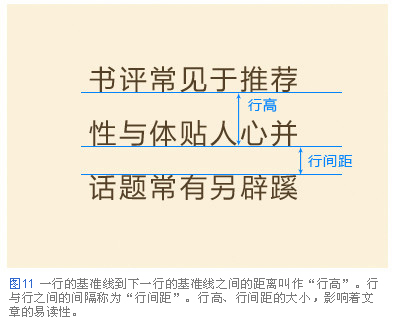 行高,行間距的大小對(duì)文章的易讀性有很大的影響。行與行之間拉得過開,從一行末尾移動(dòng)到下一行開頭,視線的移動(dòng)距離過長(zhǎng)增加了閱讀難度。相反,行與行之間貼得過緊,上下挨得過緊影響了視線的移動(dòng),讓人不知道正在閱讀哪一行(圖12)。正文最恰當(dāng)?shù)男懈?,基本?yīng)該設(shè)定為其文章中文字大小的兩倍。例如文字大小為8px的文章,就應(yīng)該把行高設(shè)定為16px(圖13)