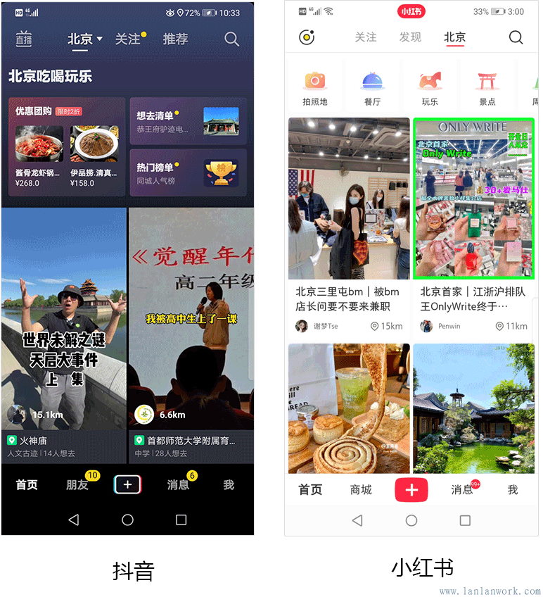 感覺小紅書比什么抖音吸引我(在沒有搜索之前推薦的東西就很吸引我),小紅書里可以學(xué)到很多東西,廚藝、書法、服裝搭配、園藝、家居、展訊,推薦的東西基本上是我感興趣的。其實(shí)這兩個(gè)APP的內(nèi)容本身都是很全的,小紅書在發(fā)現(xiàn)和北京欄目頁面是2行2列,一頁可以展示4個(gè)視頻內(nèi)容和標(biāo)題,節(jié)省了刷屏選擇的時(shí)間,相對高效。