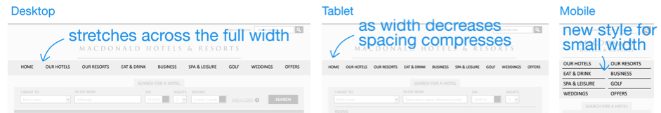 我們將使用一個真實的酒店網(wǎng)站 作為范例,來演示響應(yīng)式Web設(shè)計的流程。這個網(wǎng)站是我們在九月份剛剛為Macdonald連鎖酒店創(chuàng)建的。在整個設(shè)計開發(fā)流程中,有幾個關(guān)鍵步驟,是我們接下來要逐一展開學習的: