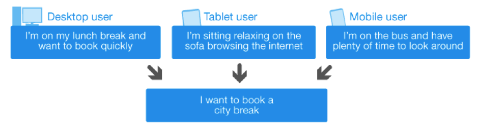 過去,我們通常會假設(shè)用戶在使用移動設(shè)備訪問網(wǎng)站時,其行為都是高度目標驅(qū)動化的,例如在旅途中獲取酒店地址、預(yù)訂房間一類。但實際情況不僅如此——智能手機、平板電腦等各類移動設(shè)備的用戶,會越來越多的在相對穩(wěn)定從容的狀態(tài)下使用網(wǎng)絡(luò)。所以在很多時候,用戶使用不同設(shè)備的目標差別并沒有想象的那么大,我們不能片面的假設(shè)不同類型設(shè)備的用戶對功能的需求差異。