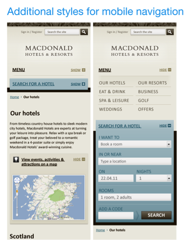 相比于傳統(tǒng)的Web視覺設(shè)計過程,在這里我們不僅要打造出風格恰當?shù)腢I元素,而且要根據(jù)前面制定下來的幾種規(guī)格方案,對某些關(guān)鍵性的UI元素進行樣式擴展或改造。例如下圖所示的酒店搜索模塊,正如我們前面提到的,在小屏幕版本中,最佳實踐方式是做成可展開和收起的模式,而這種交互方式在平板電腦或桌面設(shè)備中是不需要的。類似這樣情況,在視覺設(shè)計方面需要花些額外的功夫。
