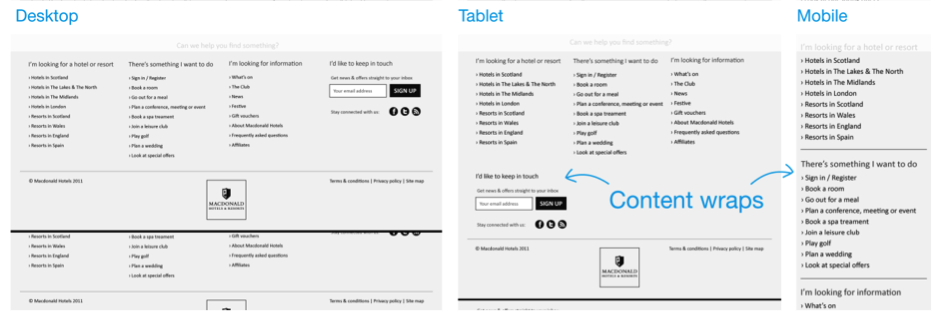 接下來我們需要考慮的是,每一列中的模塊組件應(yīng)該以怎樣的方式隨著頁面的寬度縮放而響應(yīng)式的適應(yīng)和調(diào)整。在這個過程里,保持團隊成員之間的溝通是非常重要的,包括視覺設(shè)計師、前端開發(fā)人員等;使用初步的線框原型,與大家交流模塊組件在布局和樣式方面的調(diào)整計劃,盡量在初期就讓相關(guān)成員對整個規(guī)劃做到心中有數(shù),并盡早發(fā)現(xiàn)前端實現(xiàn)等方面的潛在的問題。