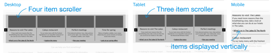 全局的四列等寬網(wǎng)格布局使其他組件的規(guī)劃也非常輕松。在首頁中有一個組件,其中包含若干內(nèi)容模塊。默認尺寸下,可以并排顯示四個模塊;左右兩邊各有一個觸發(fā)滾動的按鈕,以點擊之后模塊列表會前后滾動,以顯示更多內(nèi)容。在平板電腦類型的布局中,默認顯示的數(shù)量變?yōu)槿齻€;而在手機的小尺寸屏幕中,內(nèi)容模塊列表會變?yōu)閱瘟?,并去掉了用于左右滾動的按鈕,用戶可以上下滾動頁面,依次查看不同的模塊。