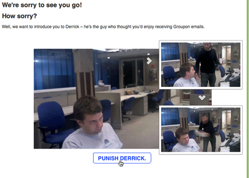 這方面最經(jīng)典的案例莫過于Groupon的著名段子,"懲罰Derrick"。雖然這個(gè)過場發(fā)生在用戶確認(rèn)退訂之后,但它通過真實(shí)的人物以及鋒利而又自嘲的幽默,切實(shí)拉近了用戶與網(wǎng)站之間的距離。在這個(gè)多多少少會(huì)使退訂用戶產(chǎn)生內(nèi)疚的段子之后,Groupon還會(huì)再慫恿用戶重新進(jìn)行訂閱。雖然你清楚的知道這是他們玩的小伎倆,但在如此具有代入感的段子面前,多數(shù)用戶會(huì)覺得非常有趣,正面情緒和狀態(tài)完全被調(diào)動(dòng)起來。