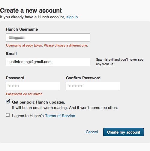 Hunch 注冊(cè)頁面當(dāng)中的文案與我們通常能夠見到的那種有所不同,他們會(huì)在輸入郵件的文本框旁邊告訴你“垃圾郵件是魔鬼,我們可不干這事”,還會(huì)在選擇郵件訂閱的地方提示你“這會(huì)是值得一讀的郵件,而且來的不會(huì)太頻繁”。在這些很普通的地方稍稍花些心思,制造一些細(xì)微的差異化,這會(huì)增強(qiáng)產(chǎn)品的代入感,使用戶的注意力更集中,跟隨設(shè)計(jì)的指引完成操作目標(biāo)。