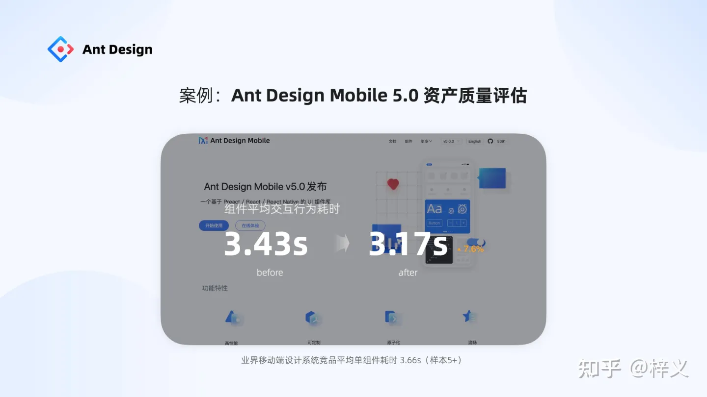 在螞蟻內(nèi)部,我們還將原規(guī)范應(yīng)用到其它設(shè)計(jì)系統(tǒng)的建設(shè)當(dāng)中。比如,Ant Design Mobile 5.0 今年引來大版本的更新,從 200+ 的冗余組件收斂成了 68 個(gè)通用組件,同時(shí)通過評(píng)估發(fā)現(xiàn)其組件質(zhì)量也提升了不少,系統(tǒng)中單組件平均交互行為耗時(shí)從 3.42 降到了 3.17,高于業(yè)界平均。