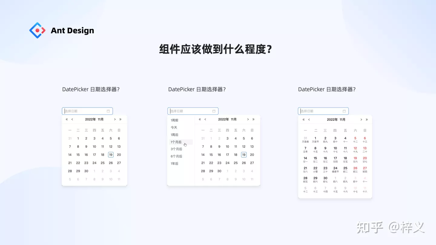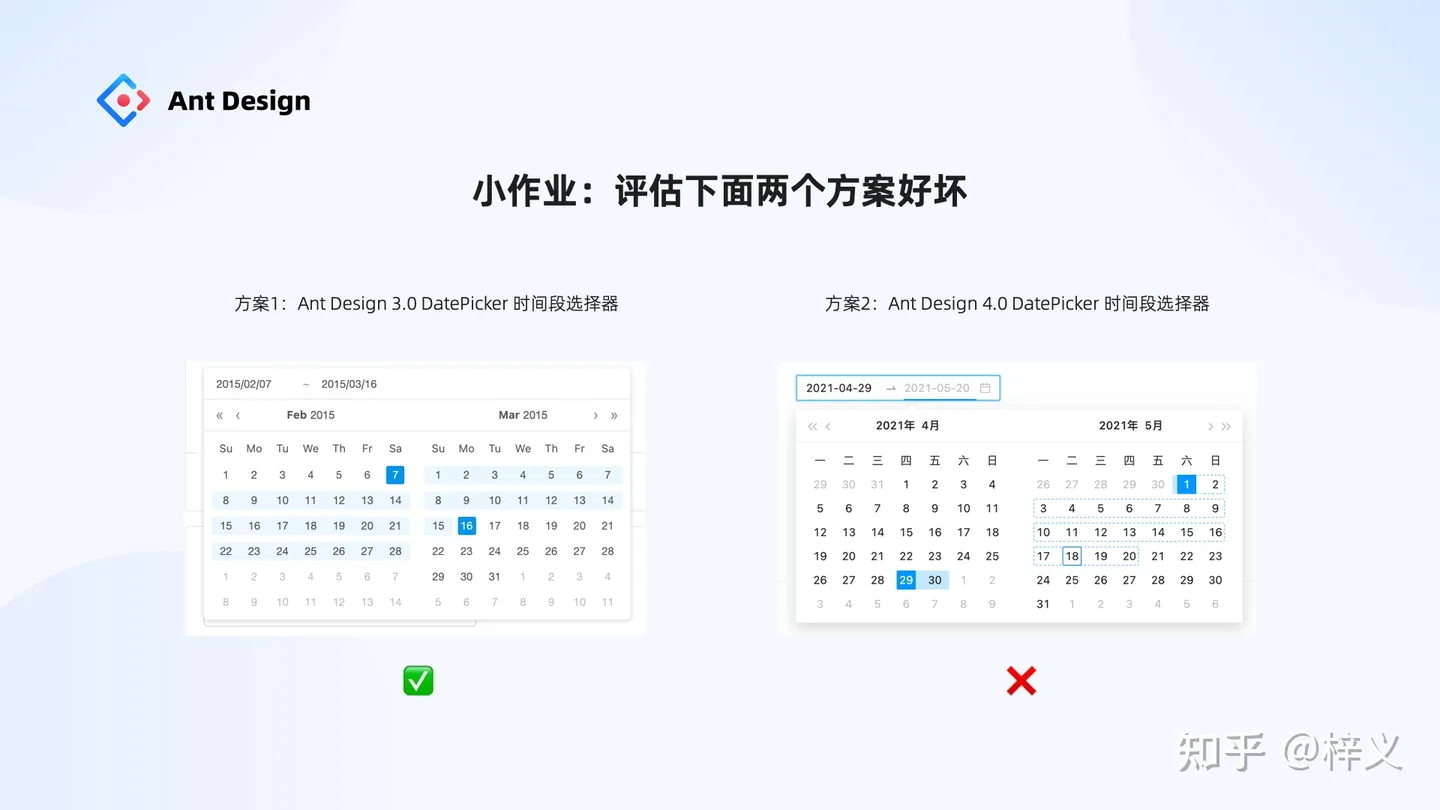 時(shí)間原因,就不再講解更多案例。這邊給大家預(yù)留一個(gè)小作業(yè),我們?cè)?4.0 的時(shí)候升級(jí)了 3.0 日期選擇器的交互,請(qǐng)大家用元規(guī)范評(píng)估模型評(píng)估一下哪個(gè)方案更好?