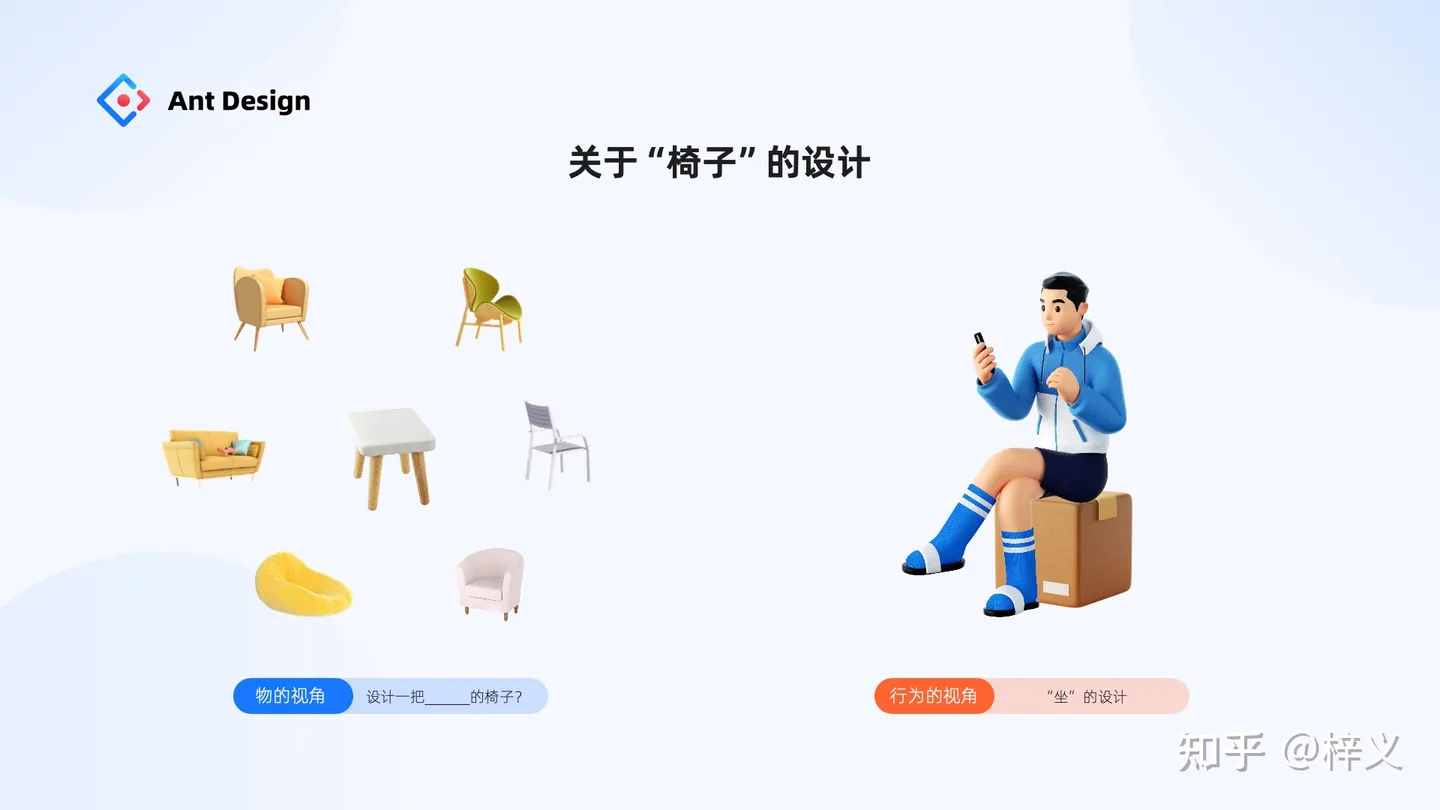 老師接著說,所謂椅子的設(shè)計(jì),不是要我們?nèi)ニ伎家O(shè)計(jì)“什么顏色的椅子”、“什么材質(zhì)的椅子” 抑或 “什么形狀的椅子”。他希望我們回歸用戶去思考,設(shè)計(jì)椅子的初衷究竟是為了什么?是為了滿足用戶“坐”這個(gè)行為目的。