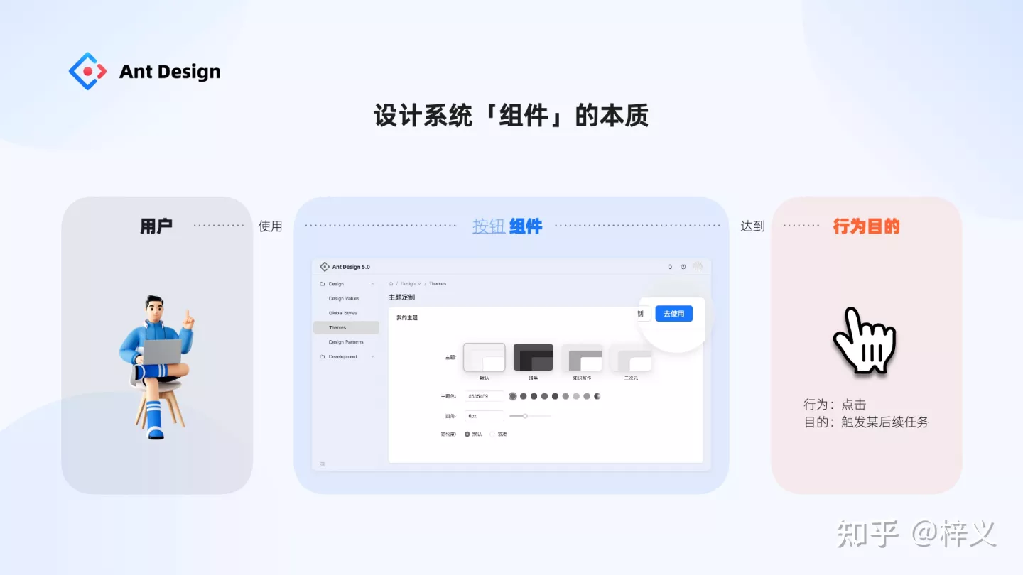 其實(shí),為設(shè)計(jì)系統(tǒng)設(shè)計(jì)一個(gè)組件,一樣如此。用戶通過界面使用我們的組件,并非為了用而用,而是為了達(dá)到他的某種行為目的。如果我們回歸到這樣一個(gè)簡(jiǎn)單的本質(zhì),那么對(duì)于組件的定義可能就十分清晰了。