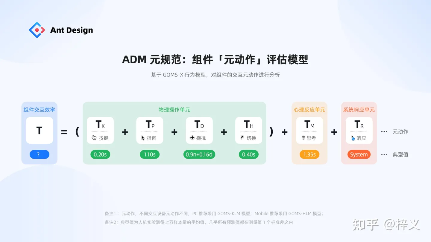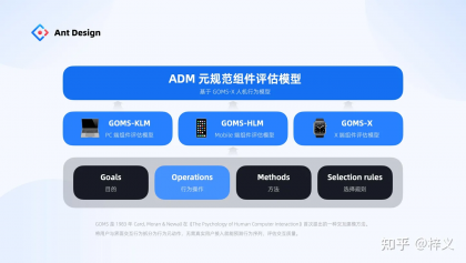 ADM 元規(guī)范的組件評(píng)估模式正式基于 GOMS 人機(jī)交互模型演變而來。GOMS 是 1983 年 Card 等人在《The Psychology of Huamn Computer Interaction》首次提出的一種交互建模方法,它的核心理念是將用戶與界面交互行為拆解為行為元?jiǎng)幼?,無需真實(shí)用戶介入就能預(yù)測(cè)交互行為的序列,評(píng)估交互的質(zhì)量。