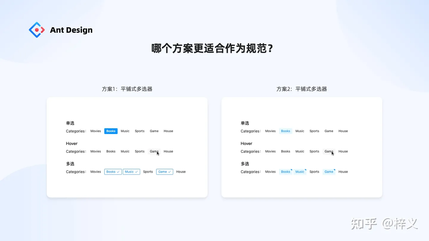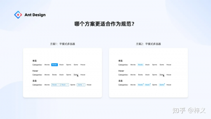 以我們開篇第四個(gè)問題提到的組件「平鋪式多選器」為例,我們到底該選哪個(gè)方案作為規(guī)范納入設(shè)計(jì)系統(tǒng)當(dāng)中呢?