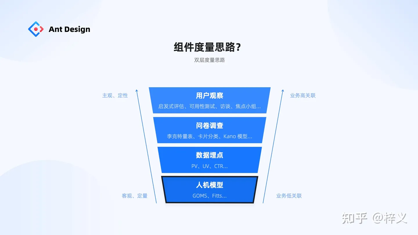 在設(shè)計(jì)研究領(lǐng)域,調(diào)研思路可抽象為以下幾類。第一 part 提到組件的本質(zhì)是「行為的規(guī)范」,因此對(duì)組件的評(píng)估,我們同樣聚焦到如何評(píng)估「組件行為」這個(gè)本質(zhì)事情上。因此我們選擇更客觀、獨(dú)立于業(yè)務(wù)的底層的人機(jī)交互模型,通過它評(píng)估而來的結(jié)果能 100% 客觀反饋交互行為的質(zhì)量。