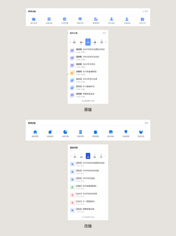 在快速入口和日程模塊中,都有使用裝飾圖標(biāo),顯然大家也能理解他們對(duì)于目前的語境來講還是細(xì)節(jié)過多了,所以需要做一些調(diào)整,讓它們簡化。