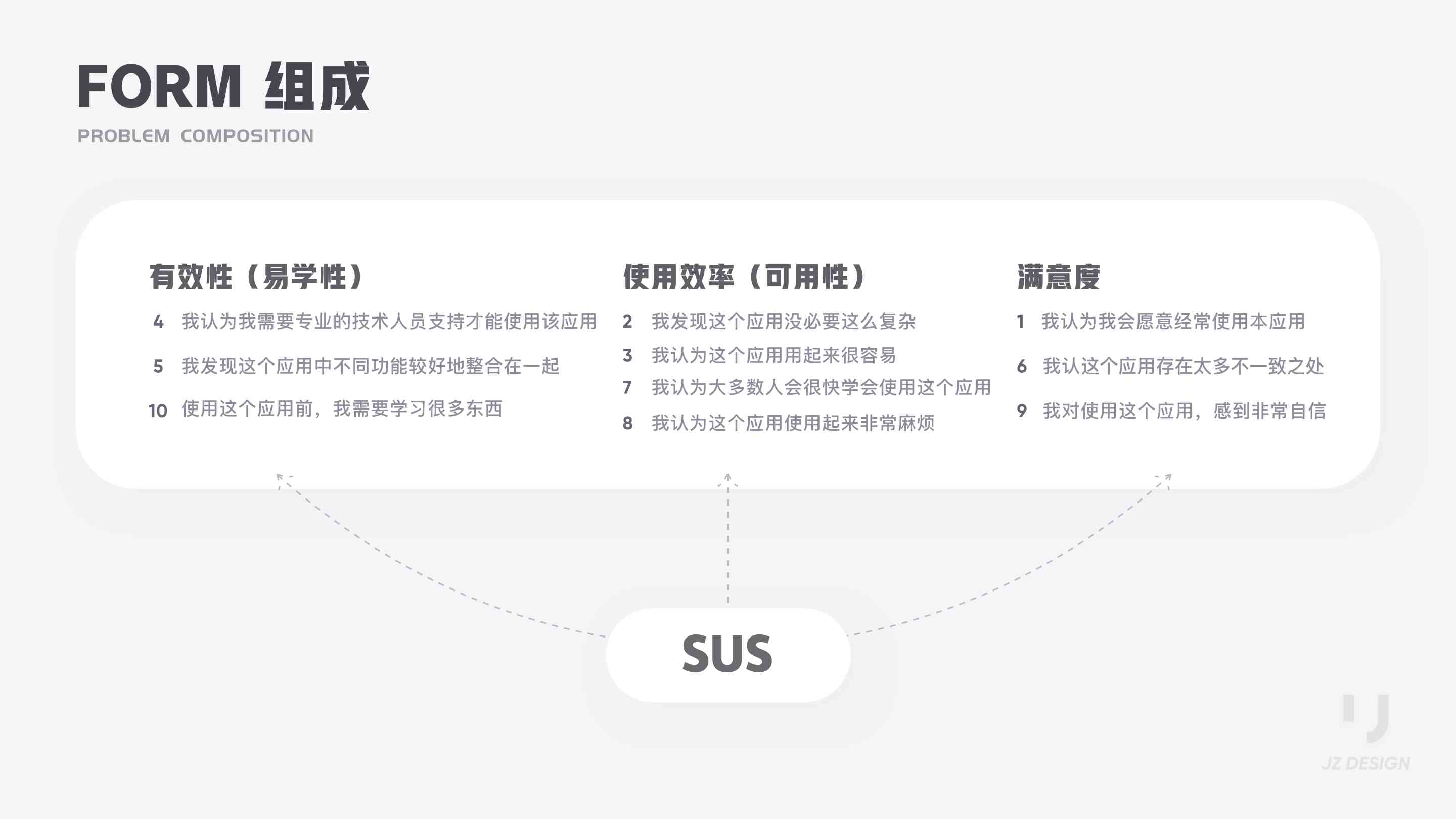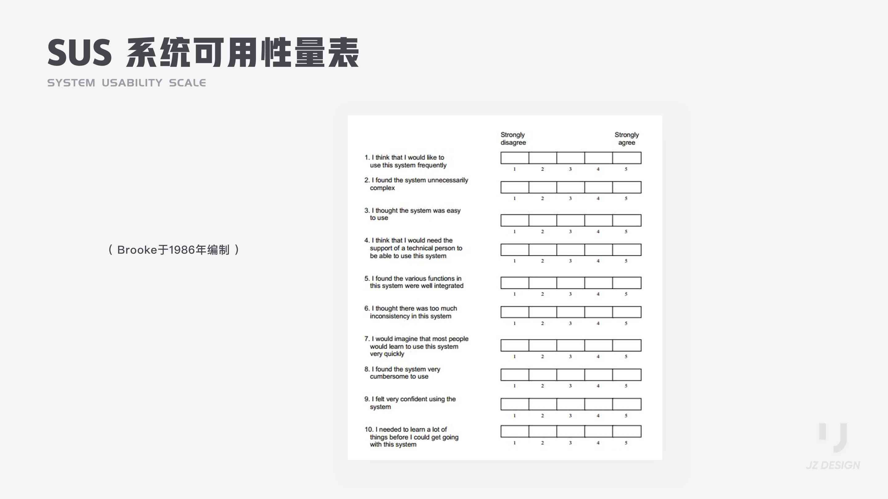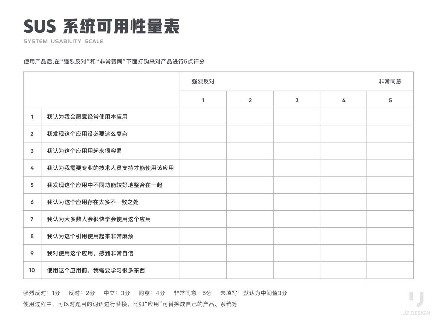 SUS 全稱(chēng) System Usability Scale ,系統(tǒng)可用性量表。SUS最初是Brooke于1986年編制,可以科學(xué)地量化用戶(hù)體驗(yàn),用于完成一系列任務(wù)場(chǎng)景后,對(duì)產(chǎn)品或系統(tǒng)整體宏觀(guān)的感知可用性測(cè)量。